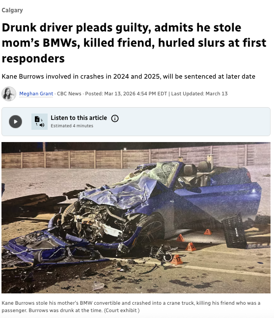 一名19岁的卡尔加里男子在法庭上承认,在短短八个月内,他偷走母亲的两辆宝马汽车、酒后驾驶并两次发生严重车祸,其中一次事故导致一名好友死亡。事故发生后,他还对赶到现场的急救人员和警察辱骂、威胁。