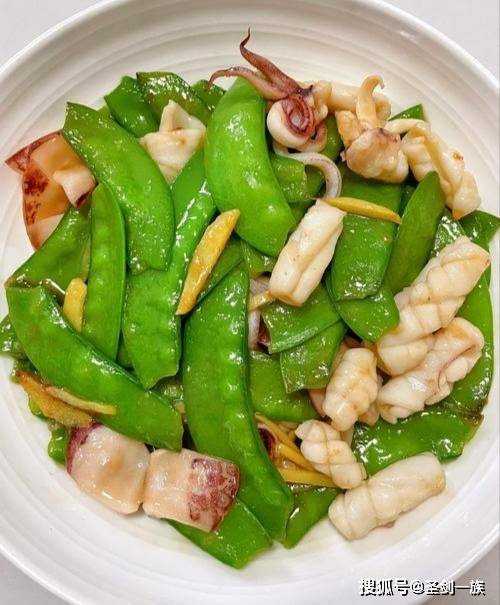 6、翻炒至调味料充分融合、鱿鱼和荷兰豆入味即可关火,趁热装盘上桌。