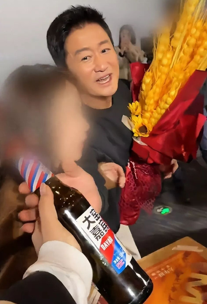 到了后台,老哥仿佛迫不及待一般,用粉丝送的周边瓶起子,将5块钱一瓶的饮料(非酒品纯饮料)起开。