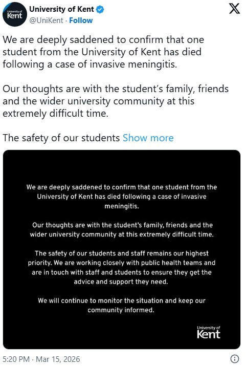 声明写道:“我们非常悲痛地确认,肯特大学一名学生因侵袭性脑膜炎去世。”
