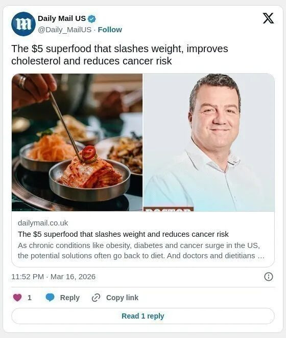 一些研究显示,泡菜可降低炎症并与结直肠癌风险下降相关。阿特金森表示,高益生菌食物(如泡菜)可能抑制致癌酶活性,对结直肠癌具有一定保护作用,但仍需进一步研究。