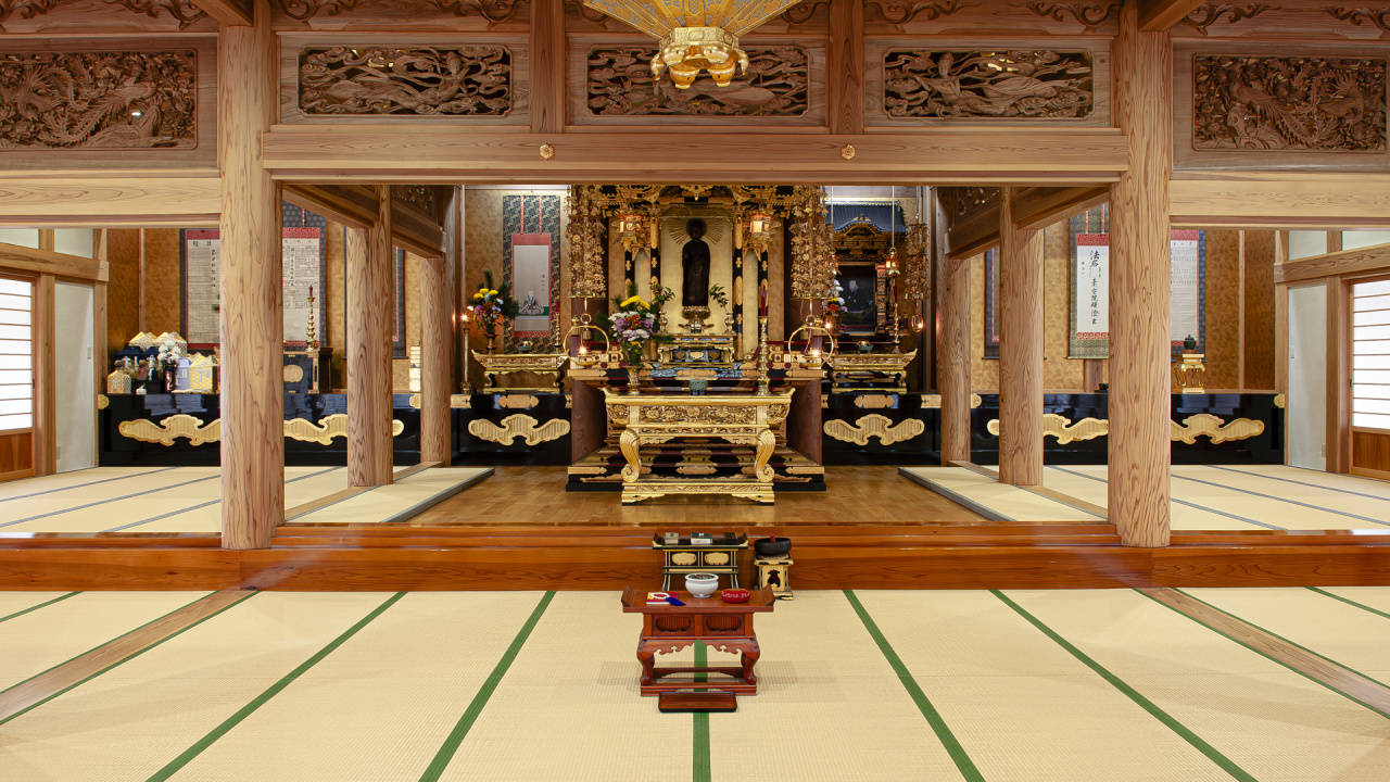 进入专念寺,最能震撼人心的是那种沉郁的色泽。日本真宗寺院的美学,向来拒绝轻佻。主殿的木料在数百年的烟火缭绕与空气氧化下,呈现出一种近乎玄武岩的深黑色。其实,那不是冰冷的黑,而是被数百年烟火与呼吸反复浸透后的玄色,带着拒绝解释的坚硬。如果伸手去触摸那些巨大的檐柱,指尖传来的不是冰冷,而是一种隔着厚重时光的微温。
