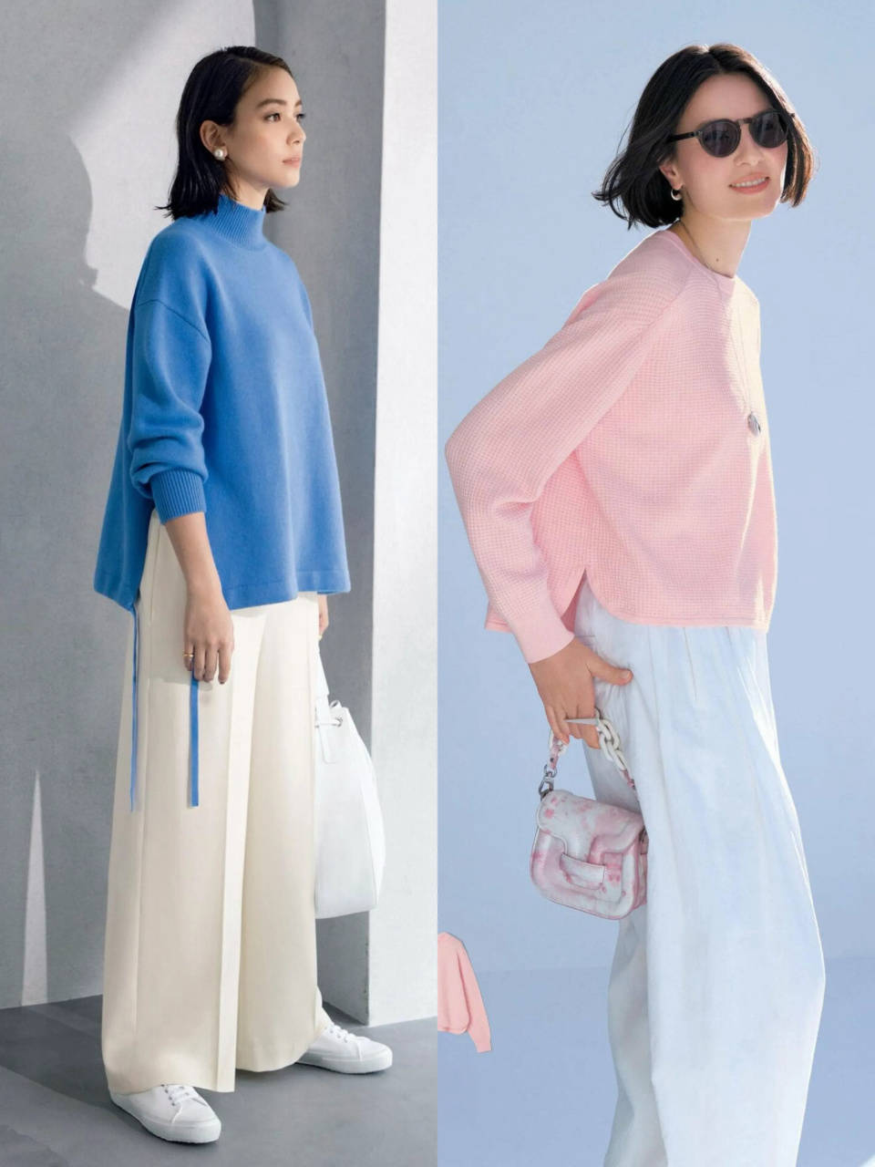 或是选择粉色的针织上衣搭配上白色的西裤,上身效果修饰肤色,显白显嫩,让人看起来更显年轻,少女气息自显,不装嫩,不张扬,在春日里不费力,轻松拿捏氛围感。