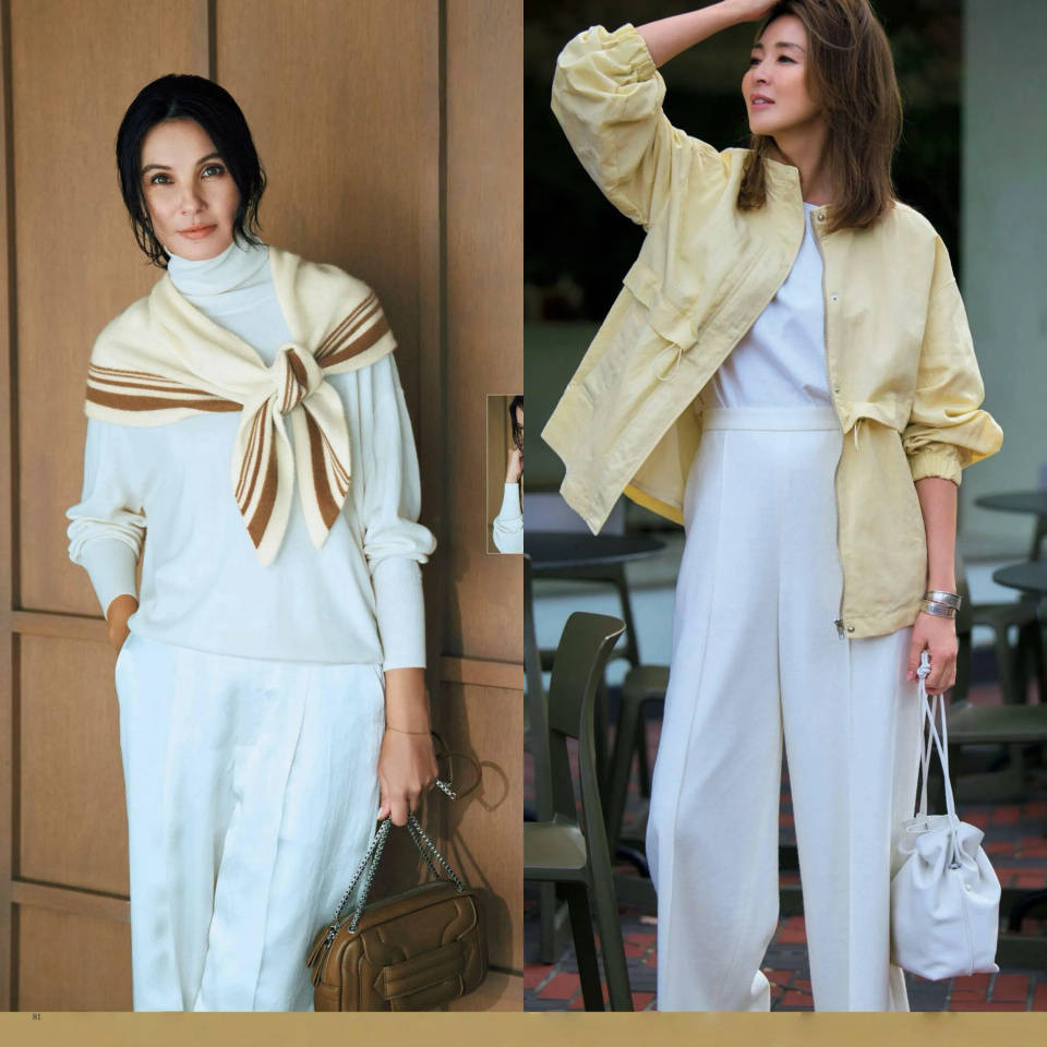 例如一条直筒白色西裤搭配浅黄色西装外套,脚踩浅黄色乐福鞋,形成色彩呼应,简约利落。