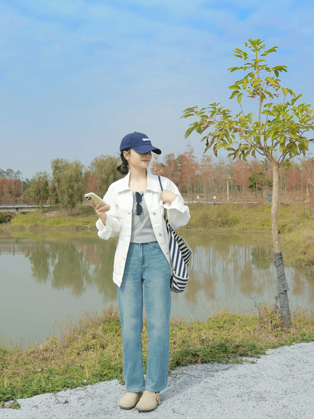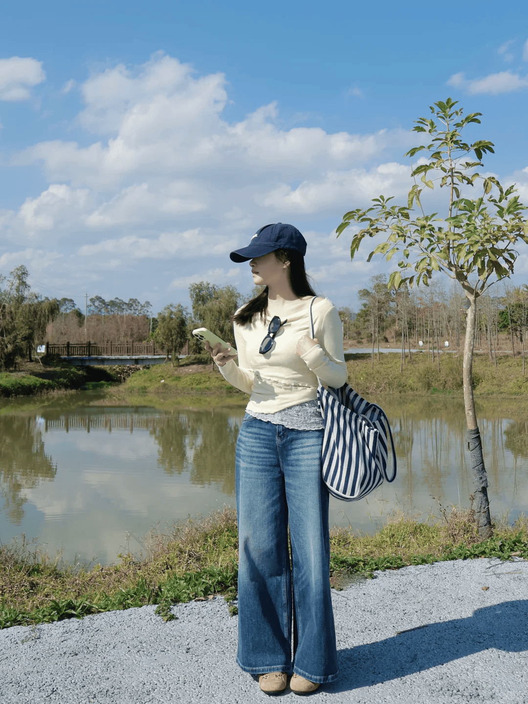 米白色羊羔毛马甲软糯温柔,内搭条纹针织衫丰富视觉层次,将针织衫下摆半塞进浅蓝色直筒牛仔裤,凸显利落高腰线。直筒裤型修饰腿型,搭配黑色帆布挎包增添休闲感,整体色调清新柔和,轻松打造甜酷又显高的春日氛围穿搭。