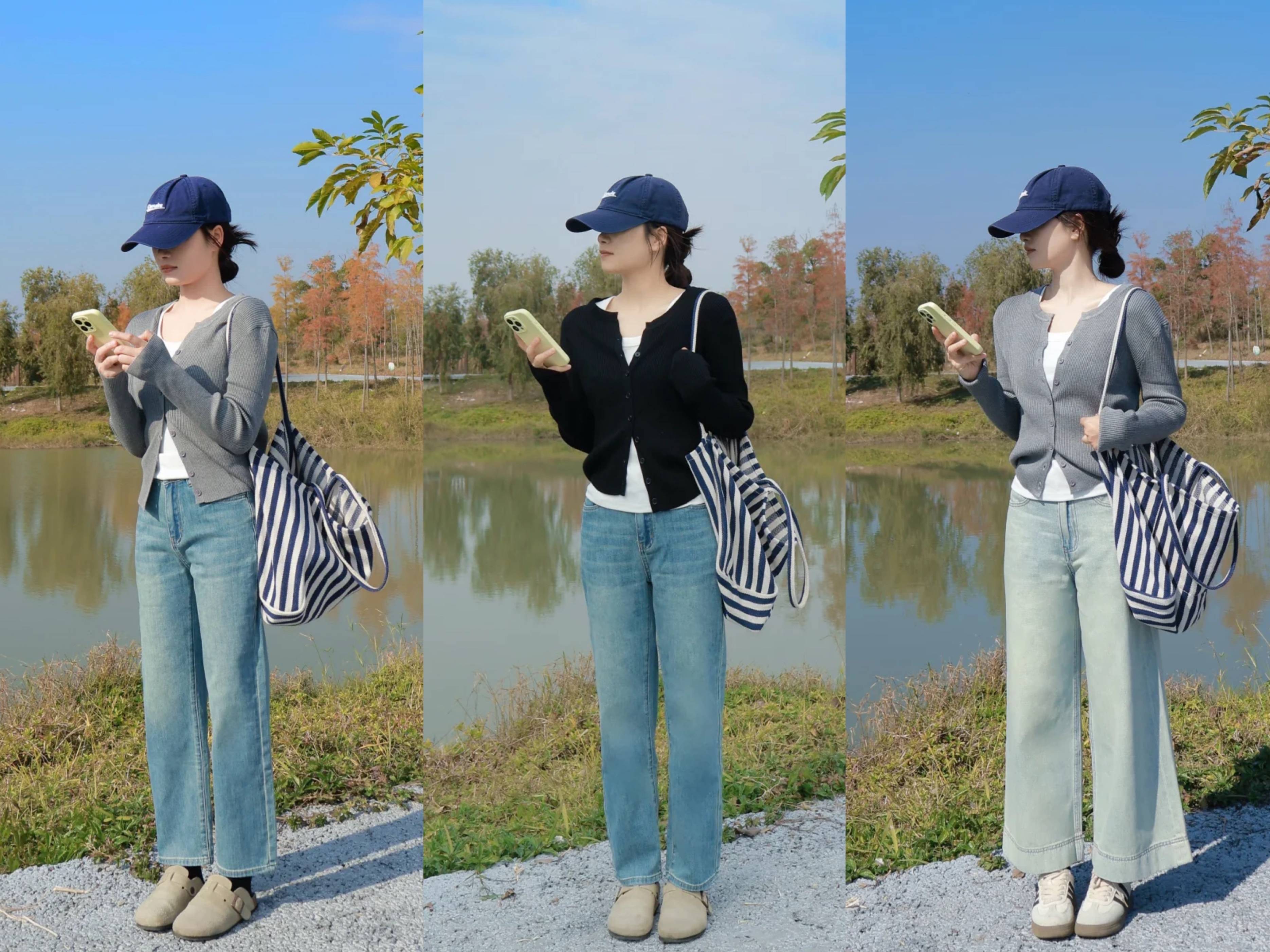 而牛仔裤的选择,尽量选择九分裤的长度,如直筒裤、烟管裤以及窄版的阔腿裤,针织衫的颜色推荐黑色、灰色或者卡其色等比较显温柔的颜色,可以学习博主内搭一件白色T恤打底,随意解开针织开衫下摆的一两颗纽扣,来打造高腰线,也是非常有助于显高的哦!