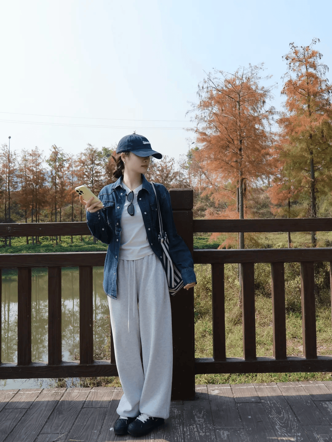 深蓝色牛仔衬衫作外套,内搭纯白T恤打造清爽基底,解开两颗纽扣更显随性。把T恤前摆微塞进灰色卫裤,既藏肚腩又暗戳戳抬高腰线。选束脚款卫裤露出脚踝,搭配小白鞋呼应内搭,轻松拿捏松弛感与显高小心机。