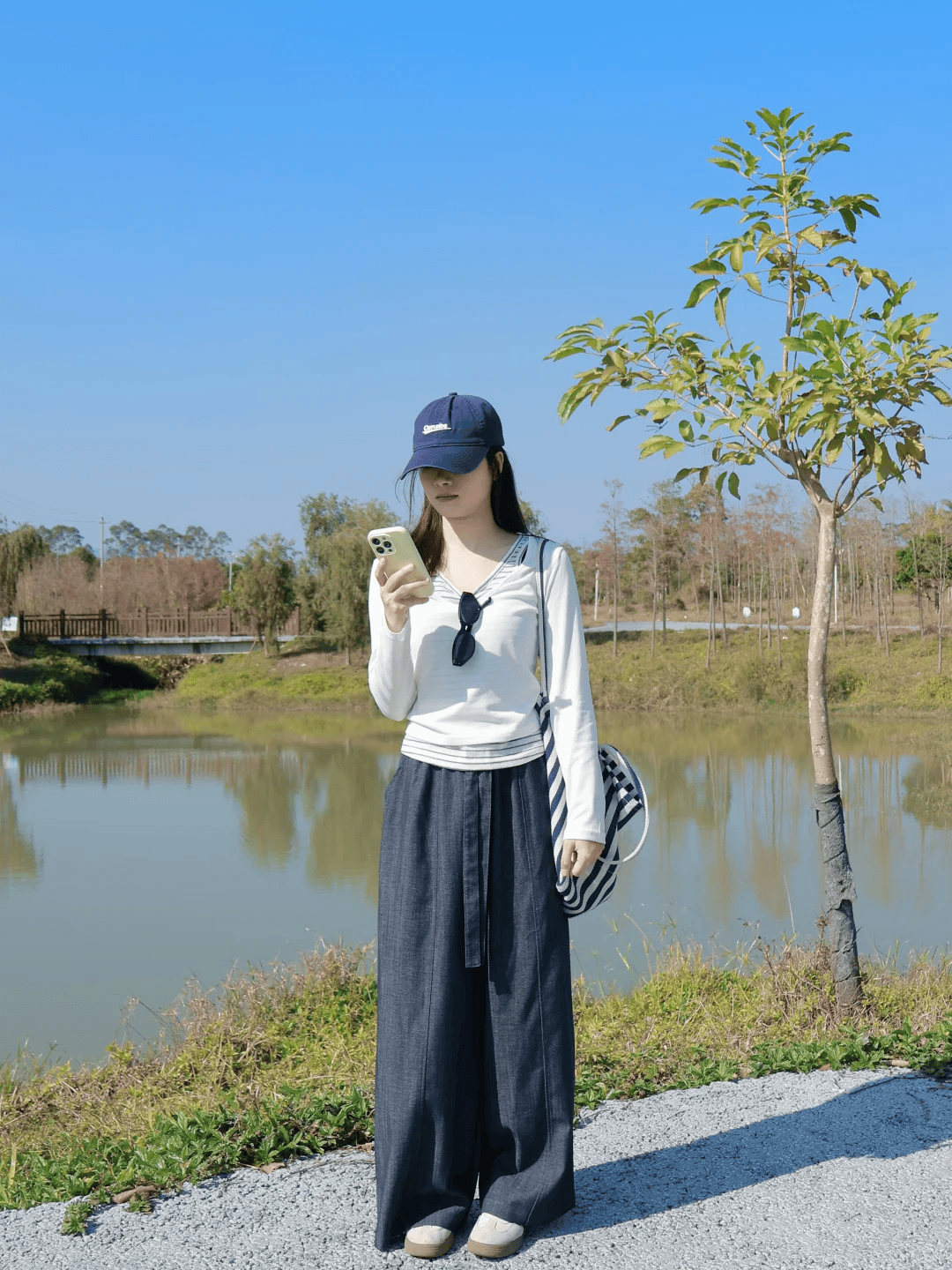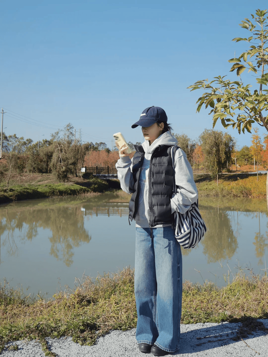 黑色羽绒马甲与灰色连帽卫衣叠穿,层次感拉满又保暖。卫衣下摆半塞进窄版牛仔阔腿裤,凸显高腰线,显腿长又利落。窄版裤型避免臃肿,搭配条纹包打破沉闷,斜挎或手提都能为整体造型增添休闲活力,轻松打造春季街头感。