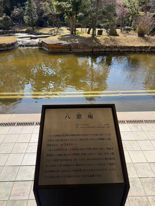 首先,是那座曾与“八窗庵”隔壑相望的“六窗庵”。它原属于兴福寺,风格上更趋近于千利休的传统,追求一种极致的内省与古朴。然而,在明治维新时期,受“废佛毁释”运动的冲击,奈良的寺院陷入赤贫。“六窗庵”如同那些被变卖的佛像一样,被迫离开了奈良的空气,被运往东京,最终落户在东京国立博物馆的庭园内。虽然建筑得以保全,但它在东京都心的繁华中,早已失去了奈良那种荒疏而深邃的气息。而那座纪念日本茶道鼻祖之一村田珠光的“珠光庵”,则守在东大寺戒坛院的深处。它代表的是茶道最原始、最质朴的源头。但历史的烟尘对它并不宽容,火灾与动荡使得它在岁月中几经更迭。虽然今日仍有重建之所,但那份最初的建筑肌理,早已在时间的磨损中变得模糊。相比之下,“八窗庵”无疑是幸运的。它虽然也经历了从兴福寺慈眼院移筑到奈良国立博物馆的过程,但它从未离开奈良这片土地。它是唯一一个在原籍守住了“光影秩序”的名席。如果说“六窗庵”代表了“流失”,“珠光庵”代表了“更迭”,那么“八窗庵”则代表了“守望”——守望着那种从江户时代流传下来的、对物质与光影的精密敬畏。如今,“八窗庵”静立在奈良国立博物馆的庭院里面,更为显眼的是那块黄澄澄的说明牌,像是一个精密的乐器,等待着光线的演奏。“八窗庵”在茶道史上的意义,在于告诉后人:追求深刻并不一定要通过自我封闭。只要懂得如何切割光影,八扇窗不仅不会破坏宁静,反而能让人在变幻的世界中,看清物质最真实的纹理。