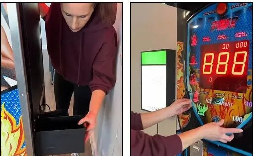 视频显示员工朱莉娅打开机器前面板,指出客人曾用胶带将其重新粘回去。随后,两人发现机器的投币箱被撬开,里面的钱已被清空。