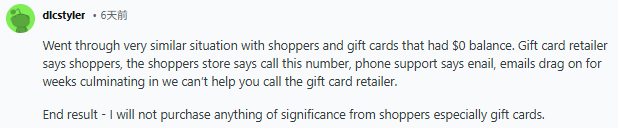 “我在Shoppers也遇到过类似的情况,买的礼品卡里面余额竟然是$0。礼品卡公司让我找Shoppers,Shoppers又让我打电话给客服,客服又让我发邮件,邮件往来一拖就是好几周,最终得到的答复是‘我们无法帮助您,请联系礼品卡公司’。结果就是:我以后绝对不会在Shoppers买任何贵的东西了,尤其是礼品卡。”