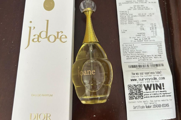 “我祖母今年75岁了,最近想重新开始约会,”Vien说。“她让我帮她买这款她很喜欢的香水。她给了我现金,我还用了Optimum积分抵扣,最后一共花了198.88加元。”
