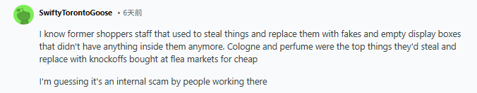“我认识一些Shoppers的前员工,他们会偷商品,然后用假货替换,或者直接把盒子换成空的展示盒,里面其实什么都没有。古龙水和香水是他们最常偷的东西,偷走后就用在跳蚤市场便宜买来的仿制品来替换。我猜这很可能是内部人员搞的。”