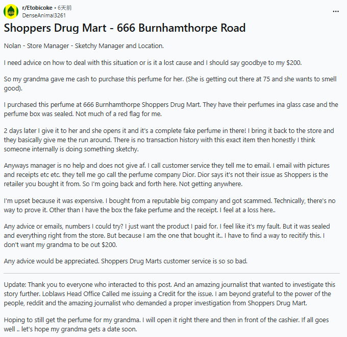 “我之前在密西沙加的Shoppers买过一瓶香奈儿香水,结果发现他们店里所有的香水都有问题。我买的那瓶是200毫升装的,里面的液体明显不对劲,说明店里肯定有问题。”