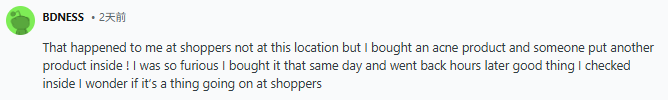 “我在Shoppers也遇到过类似情况,不过不是这家店。我买了一款祛痘产品,结果里面被别人换成了另一款产品!我当时真的气坏了,当天买完后几个小时又跑回去,幸好我检查了。不知道Shoppers是不是经常发生这种事。”