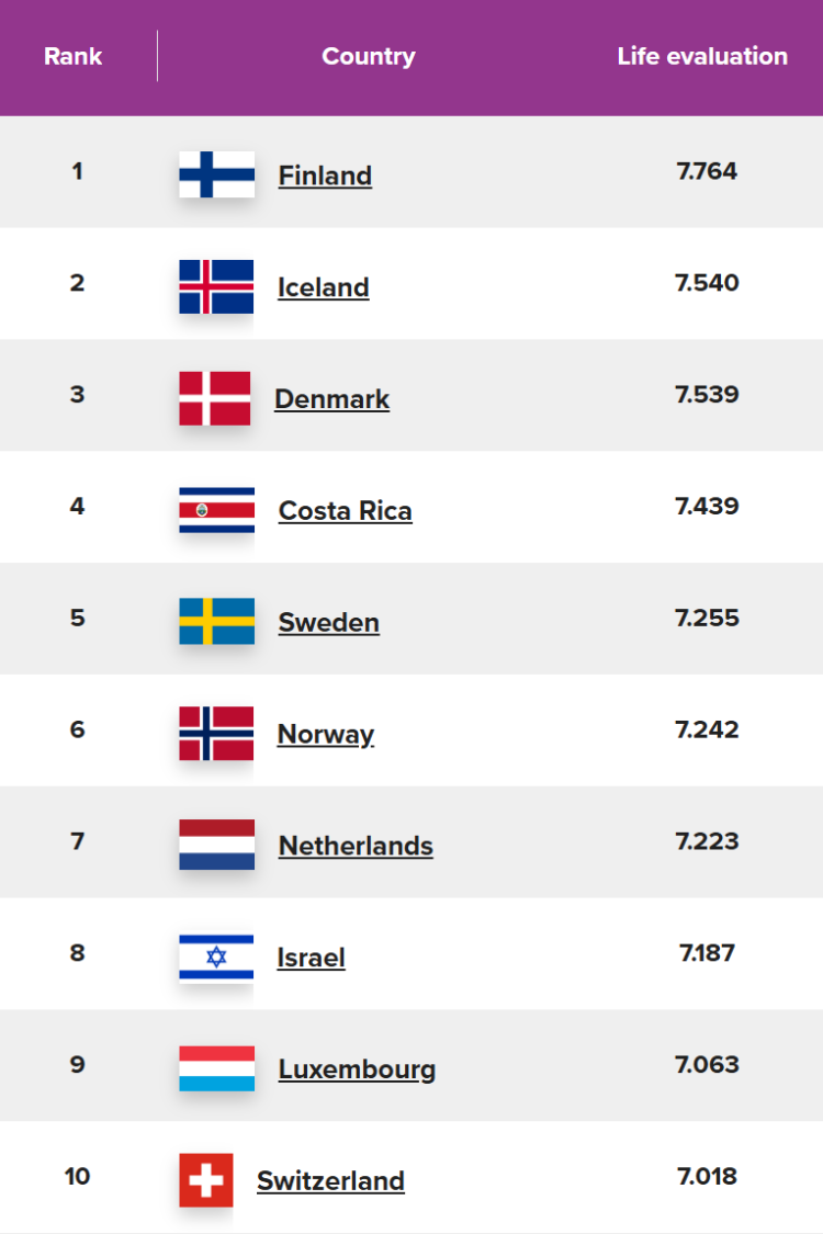 但你看看芬兰——人家连续9年蝉联全球最幸福国家,平均分7.764。差距一目了然。