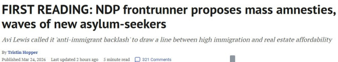 加拿大民众对移民规模的不满情绪正在迅速上升,然而新民主党(NDP)领袖竞选人Avi Lewis近日却提出,要将移民数量恢复至疫情后的高位,并重新向数百万来自美国的潜在庇护申请者开放边境。