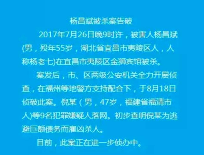 据中国媒体报道,2017年7月26日晚9时许,被害人杨昌斌(男,殁年55岁,湖北省宜昌市夷陵区人,人称 杨老七)在宜昌市夷陵区金狮宾馆被杀。经最高人民法院核准并签发执行命令,宜昌市中级人民法院于2020年9月30日对犯故意杀人罪的罪犯倪龙、陈强执行死刑。