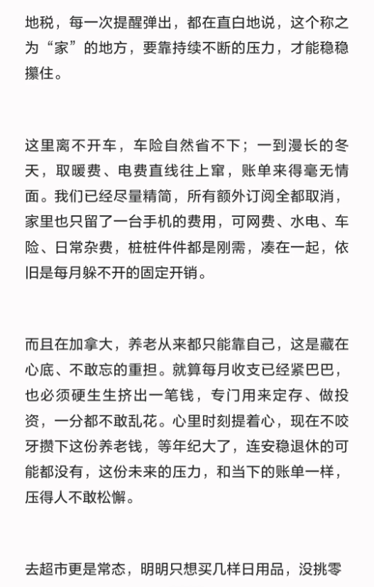 许多中产家庭正面临同样的“隐形贫困”——收入不低,却始终在温饱线上挣扎。最近一位网友就发出这样的慨叹:加拿大生活实在是不容易。
