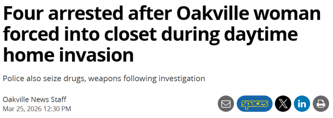 大多伦多荷顿区警方(Halton Regional Police)近日通报,一起发生在奥克维尔的入室抢劫案已告破,共有4名嫌疑人被捕,并面临数十项刑事指控。