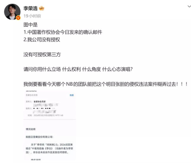 李荣浩被激怒,于是到网上发文讨说法。