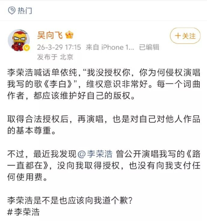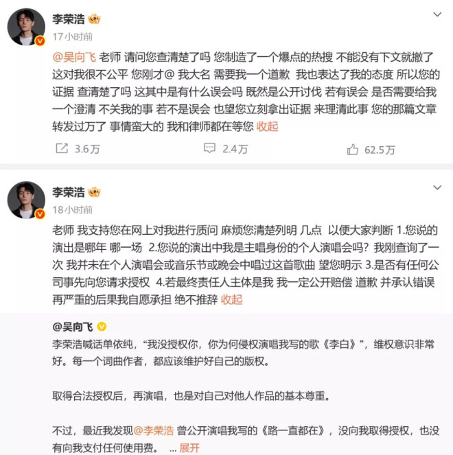 单依纯这边正在想对策,一个叫吴向飞的突然出来@了李荣浩,称他也应该向自己道个歉,因为李荣浩曾公开演唱过他写的歌《路一直都在》,而且没有获得授权。