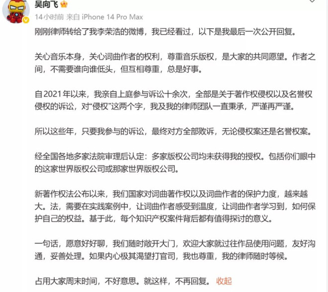 更重要的是,2013年这首歌的版权由环球音乐代理,吴向飞这几年一直在和环球打官司,直到近几年才收回著作权。
