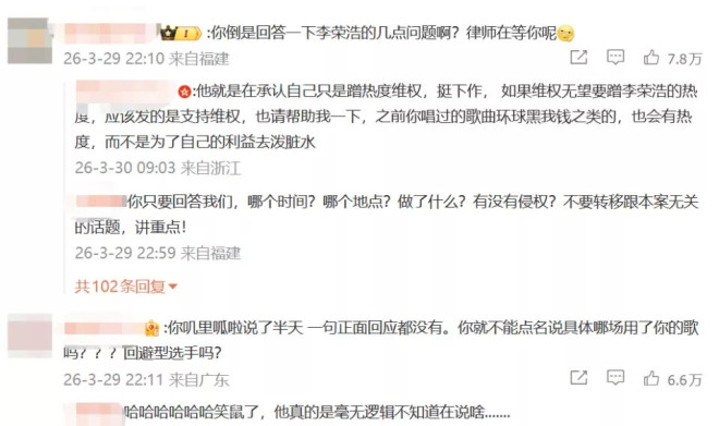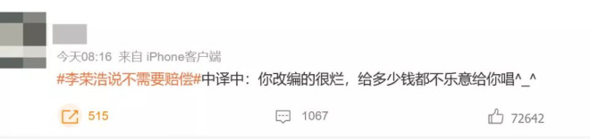 网速飞快的李荣浩迅速作出回应,让对方列清楚4点,如有侵权一定公开赔偿道歉。