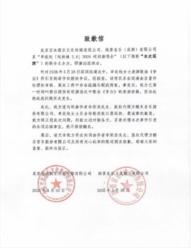 演唱会结束后的单依纯在凌晨发长文正式回应,向李荣浩和受到影响的人再次道歉。