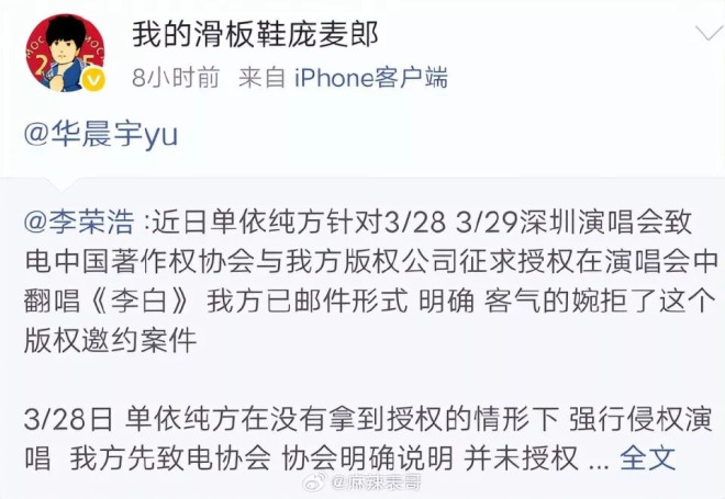 大意是单依纯想在自己演唱会上演唱《李白》这首歌,李荣浩作为创作者明确拒绝了,但单依纯在未获得授权下,还是在演唱会演唱了这首歌。