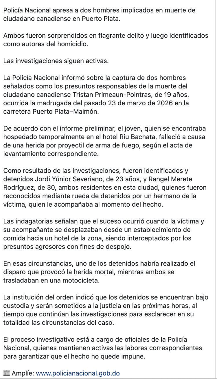 “多尼加国家警察逮捕了两名涉嫌参与杀害加拿大公民Tristan Primeau-Pointras(19岁)的男子。该案件发生于2026年3月23日凌晨,地点位于Puerto Plata至Maimón公路。