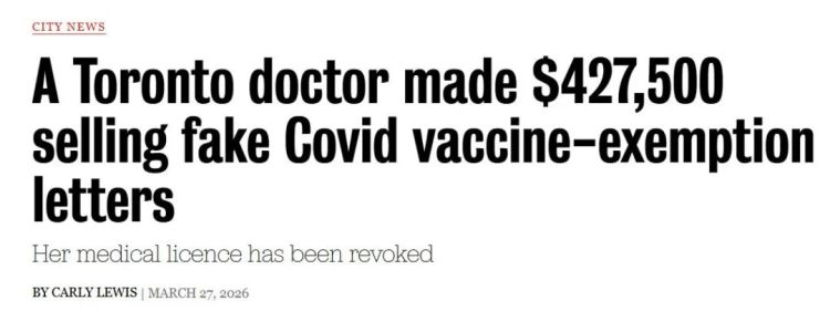 近日,因在2021年疫情期间,涉嫌通过大量开具新冠疫苗、口罩和检测的“豁免信”牟利高达 $427,500,多伦多一名医生的行医执照被正式吊销。