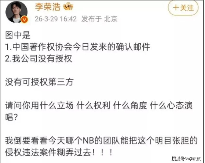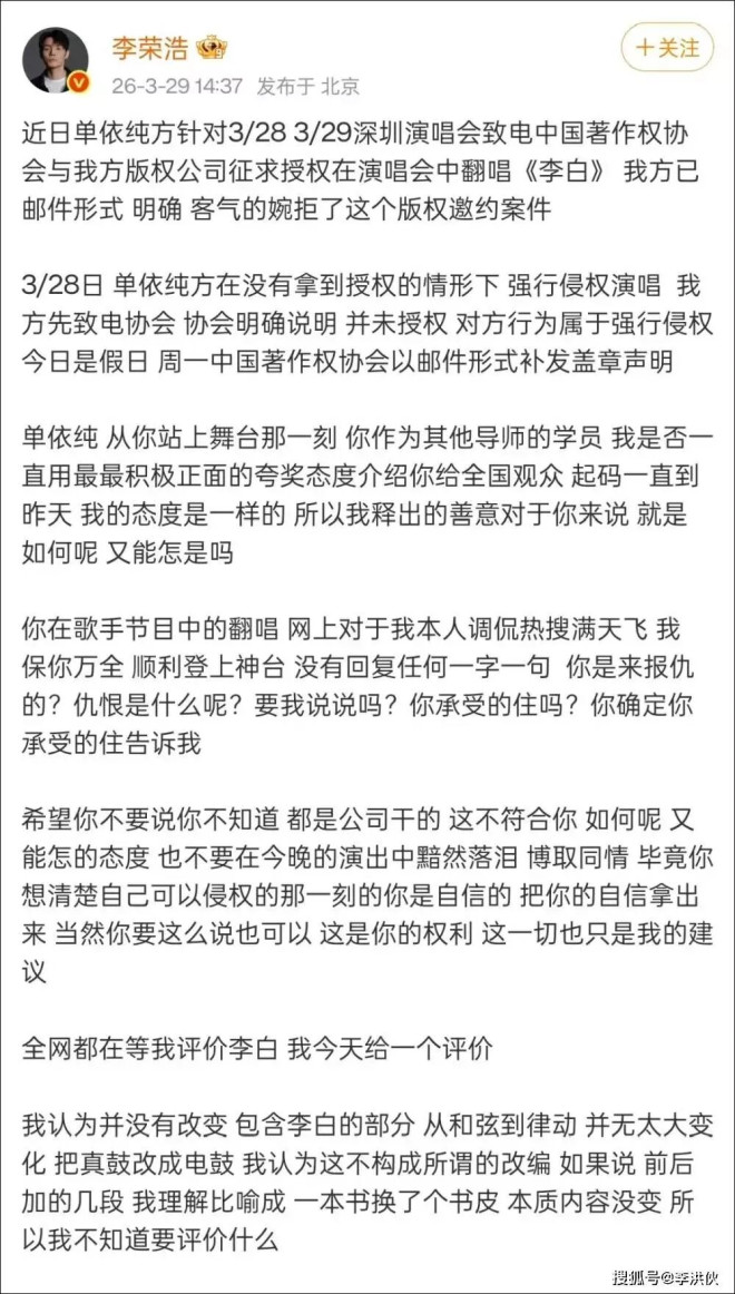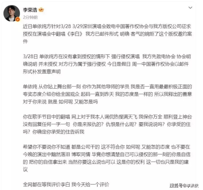 李荣浩忍无可忍,连发两条博文,把证据拍在台面上。质问单依纯:以什么立场、凭什么权利,演唱自己的原创作品。