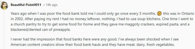 有一位网友分享了个人经历,揭示贫困背后的现实与无奈。这位安省居民回忆,自己在2002年经济困难时,食物银行规定“三个月才能领取一次”,在支付房租后几乎没有任何剩余收入,只能依赖施粥所维持生活。还有人提到,曾从教会领取到“生蛆的饼干、过期的意面和变质的罐头”。