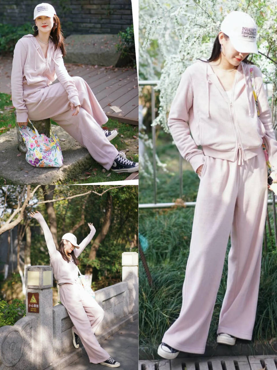 一双经典的黑色帆布鞋,配上粉色的休闲套装和粉色的棒球帽,自然呈现少女气息,不刻意装嫩也能显年轻,风格可塑性比较强。