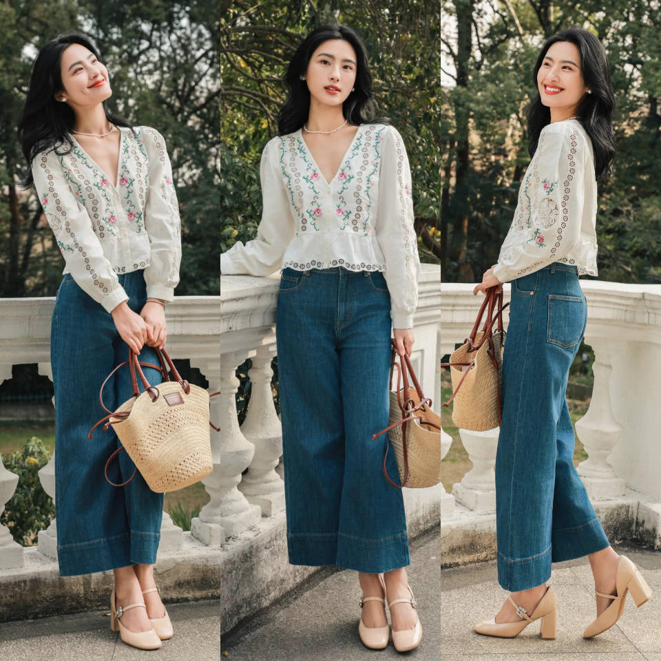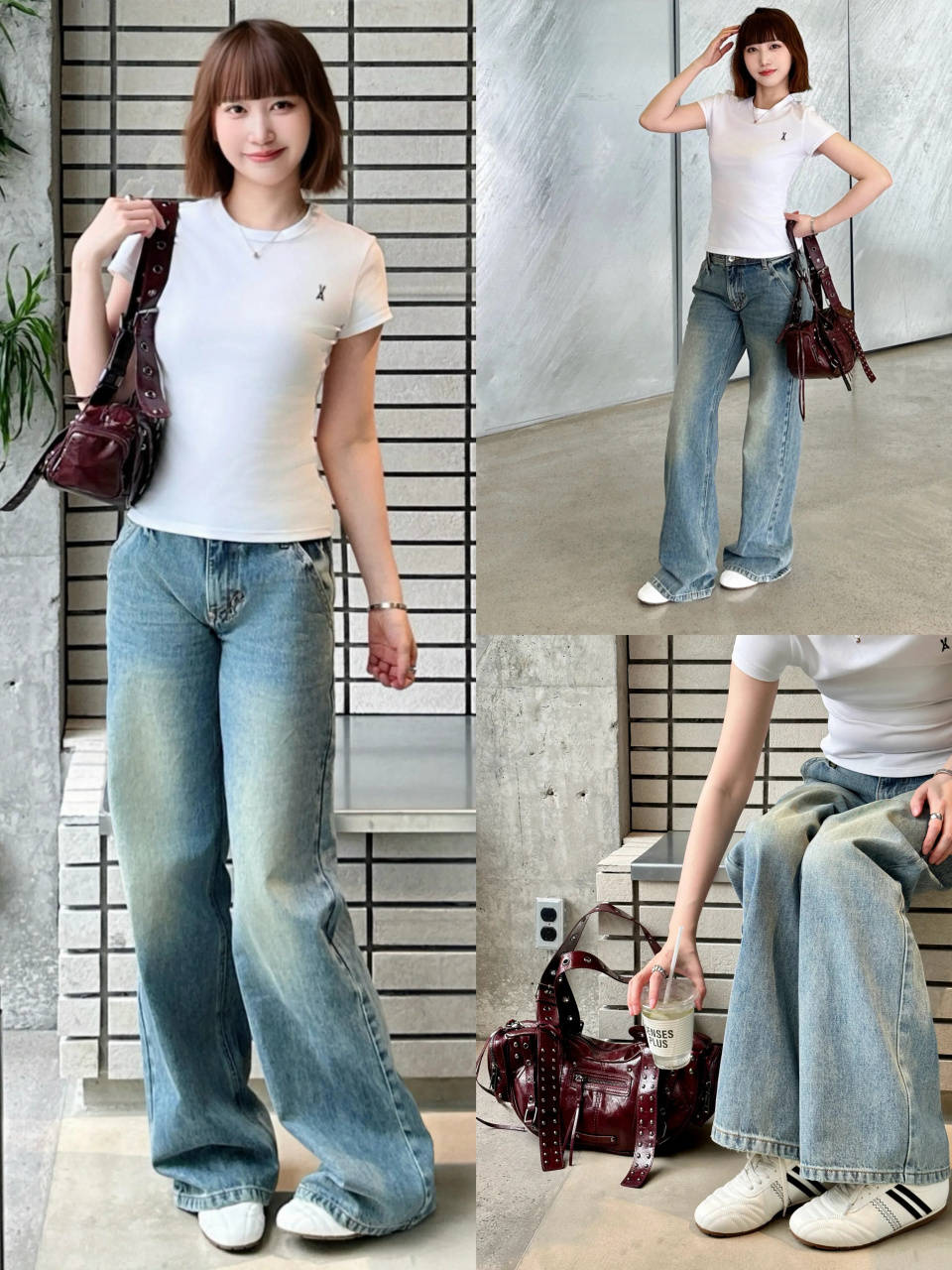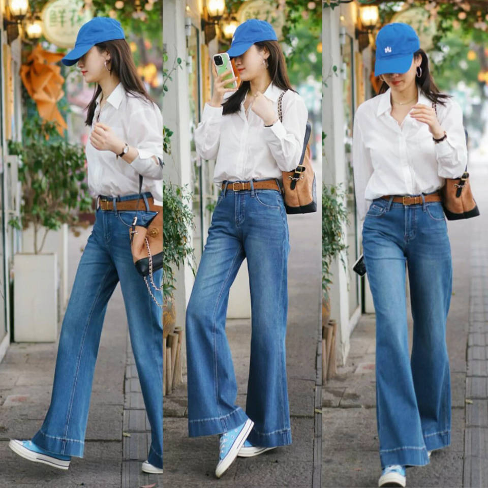 或是换成一件白色 T 恤,搭配上蓝色牛仔直筒阔腿裤和白色的德训鞋组合,简约通勤时髦。