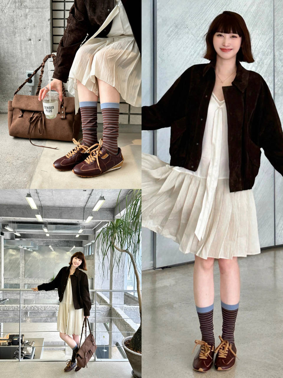 若是年轻貌美的少女,这时候咱们不妨选择一双棕色的德训鞋,配上白色的百褶短裙和白色雪纺衬衫,外披棕色夹克外套和鞋子形成色彩呼应,甜美又俏皮。