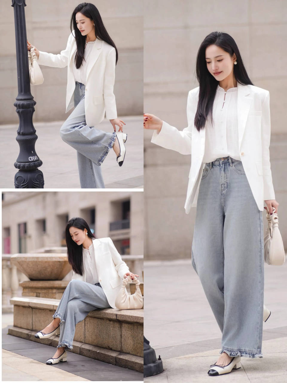 换成一件白色的西装外套,配上白色衬衫和蓝色牛仔裤,脚上穿着一双黑白拼接色的玛丽珍鞋,这样的打扮风格休闲又通勤时髦,日常出行、职场办公也会穿搭,让你不费力就能轻松拿捏时尚潮流。