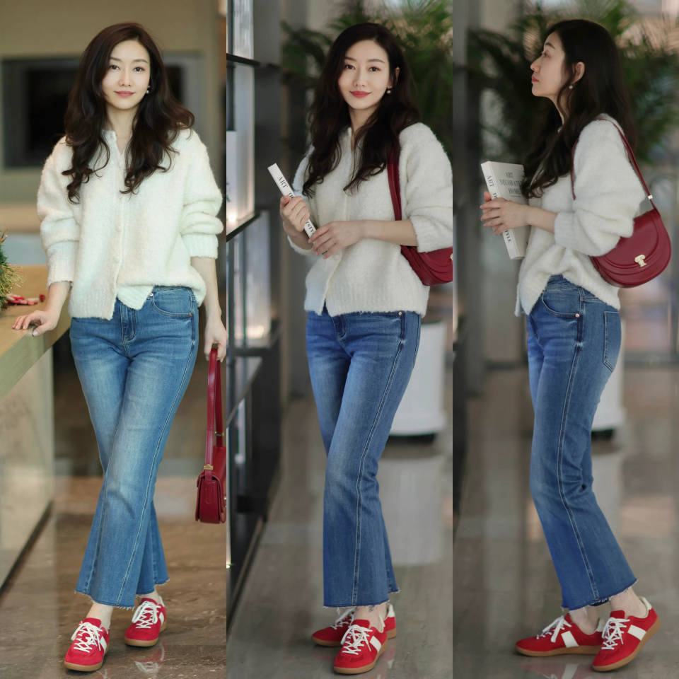 选择红色德行鞋,配上蓝色牛仔九分裤和白色的针织开衫,背着红色腋下包和鞋子形成色彩呼应,整体穿衣造型注入了简约休闲的运动气质,既舒适又洋气。