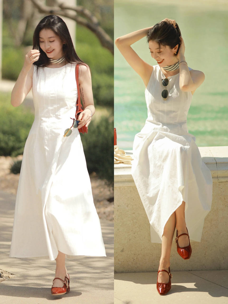 例如,用红色“玛丽珍鞋”配上白色无袖连衣伞裙,整体造型呈现出少女气息,活力感满满。