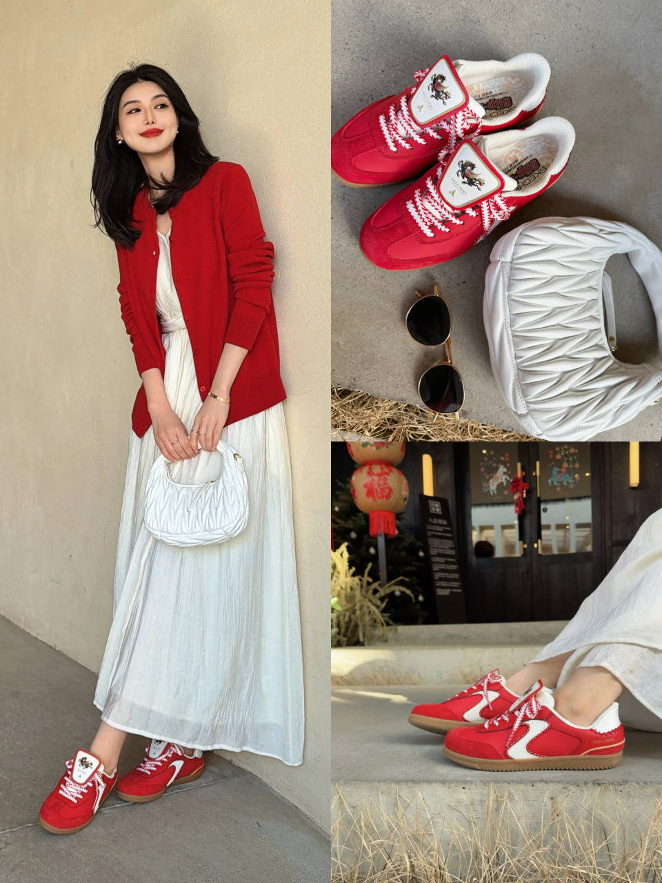 或是换成一件红色的针织开衫搭配白色伞裙加彩虹色德训鞋,使得穿搭者朝气蓬勃,元气感满满。