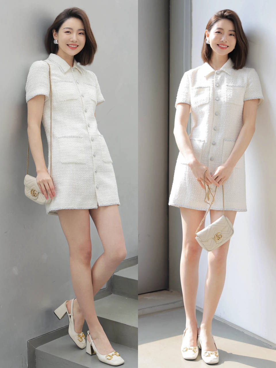 在南方城市,白天出太阳时天气已经有点炎热,这时我们选择更清爽的穿衣风格,用小香风裙装配上一双白色粗跟穆勒鞋,显得清爽时髦,又能延伸腿部线条,呈现大长腿优势,日常通勤上班或者是约会穿搭,既精致又显高级。