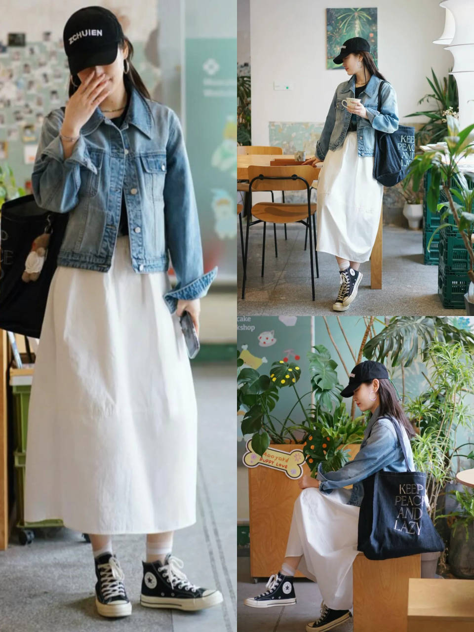 当我们换成一件蓝色牛仔外套,配上白色伞裙和黑色的帆布鞋时,这样优雅帅气的造型谁能不爱?咱们普通素人照着穿就可以摆脱路人感,秒变成时髦精。