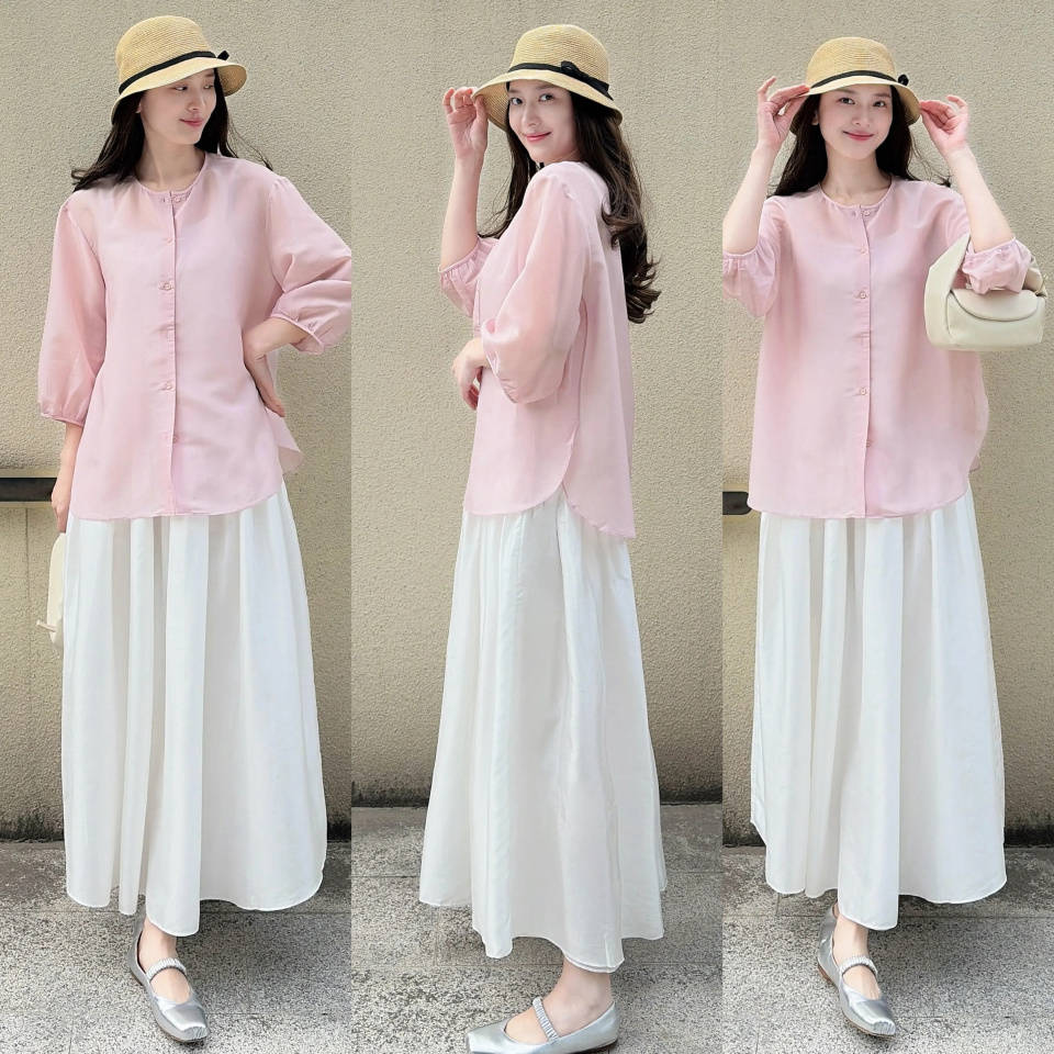 选择一件粉色的衬衫配上白色伞裙,脚踩银灰色玛丽珍鞋,少女感自显,戴上一顶草帽,氛围感直接拉满。