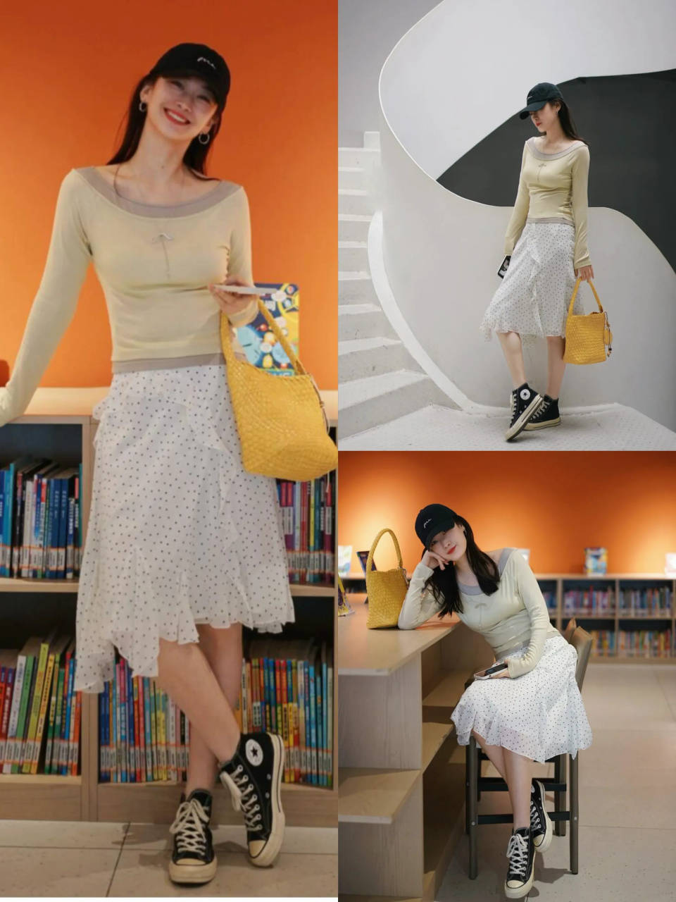 偏爱少女的甜美气质风,就可以选择一双经典的黑色帆布鞋,搭配波点的伞裙和一件软糯亲肤的浅鹅黄色针织上衣,戴上一顶棒球帽,即可让你变得随性时尚。