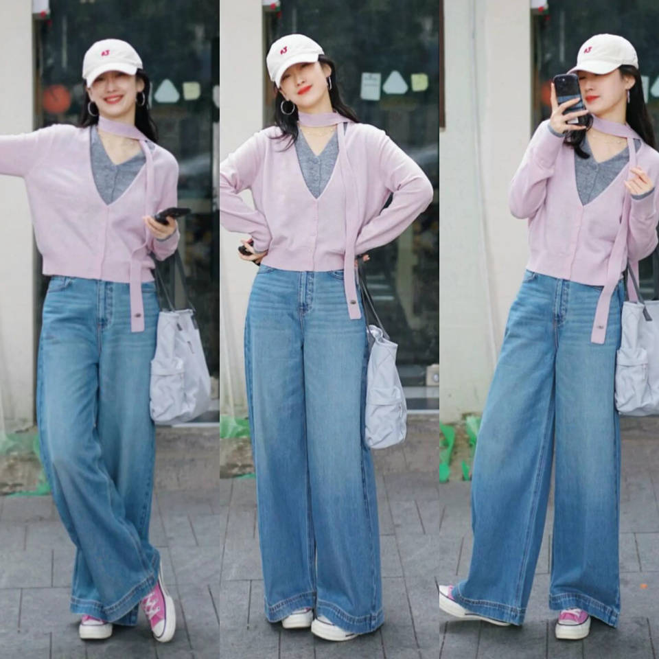 粉色的帆布鞋穿在脚上就能让你 get 到春日的氛围气息,更显少女感。配上一条蓝色牛仔阔腿裤和粉色针织开衫,叠穿灰色打底针织衫,简约利落,通勤时髦。