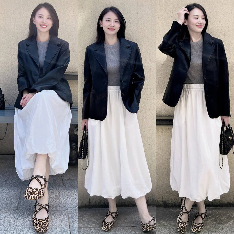 当我们换成一双豹纹的玛丽珍鞋,配上白色伞裙和一件黑色皮衣外套,内搭黑色针织衫,使得造型利落中带着那么一点个性。轻松摆脱穿衣打扮过于单调问题,不得不说,时尚造型贵在穿搭细节里。