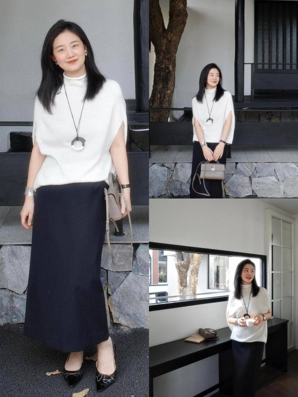 Tips②:白色宽松针织衫+黑色直筒半裙