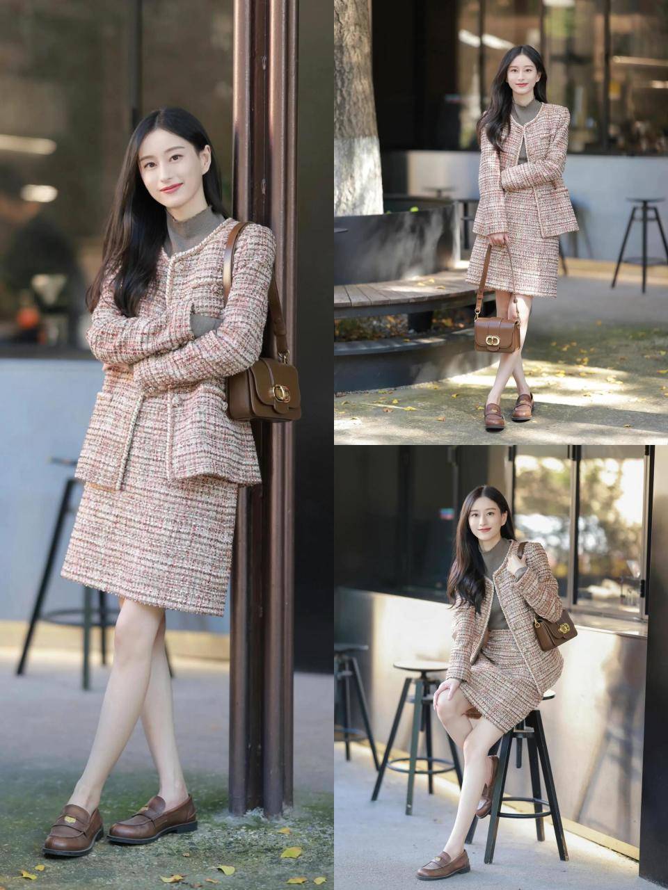 若是担心自己穿小香风外套配不好裙子,不妨直接选择小香风裙装来穿搭,可以降低出错率。例如上面这一套,粉色小香风裙装内搭灰色毛衣,脚踩棕色乐福鞋,精致又显贵,少女感十足。