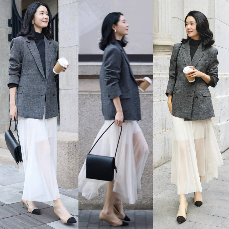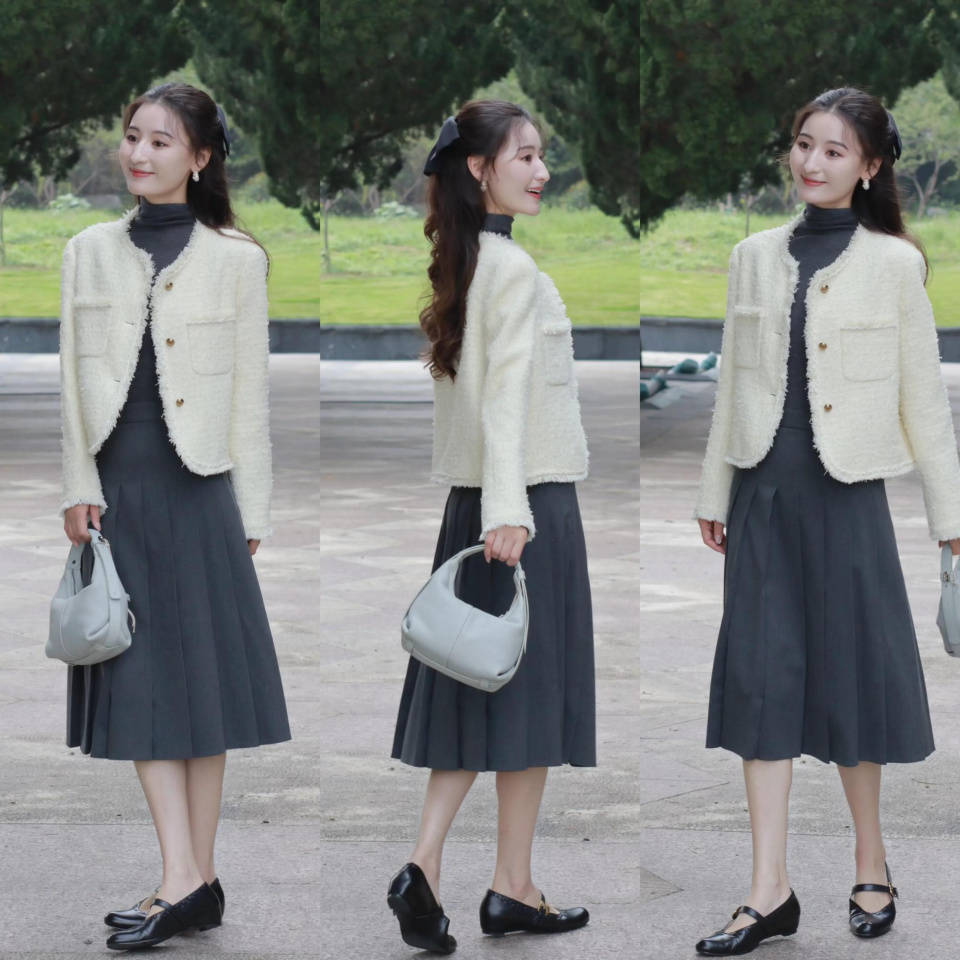 或是选择最基础的色彩穿搭更显高级,有时候简简单单反而更显贵。例如上面用白色小香风外套,内搭灰色针织毛衣和一条灰色鸭褶半裙,脚踩黑色低跟单鞋,这样的穿衣造型多种场合都适配,整个人自带清爽又轻盈的气质感。